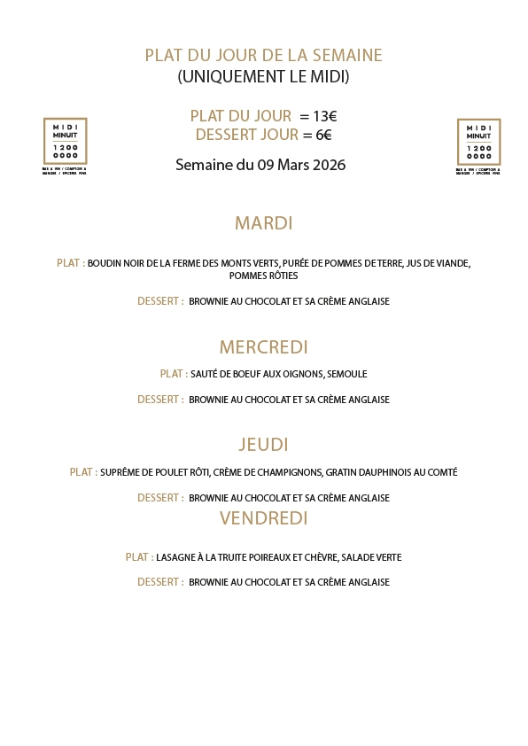 Menu de la semaine Toutes les semaines, retrouvez le menu de la semaine à jour et concocté spécialement pour vous ! Partagez l'article